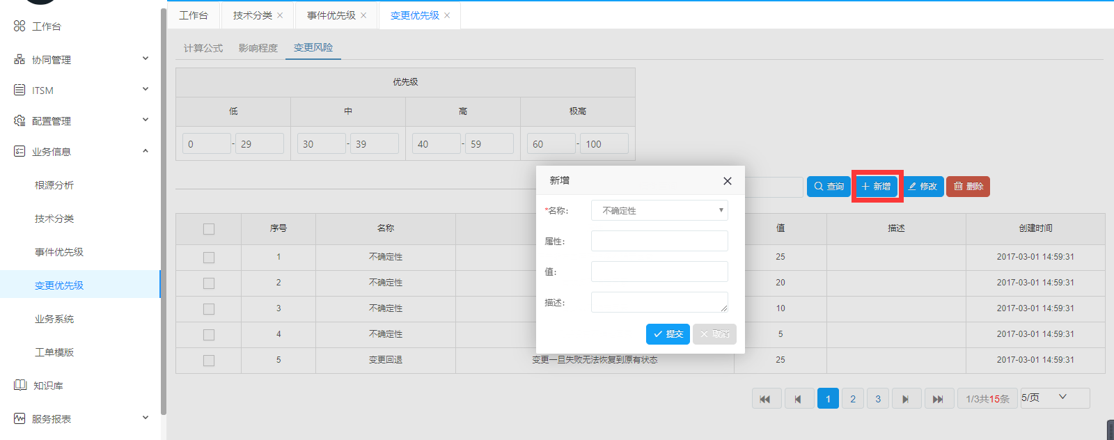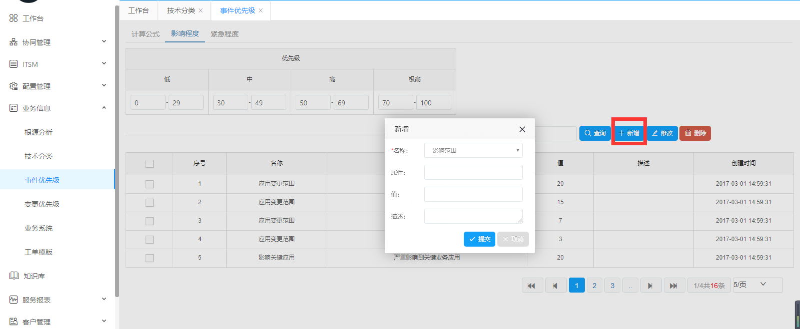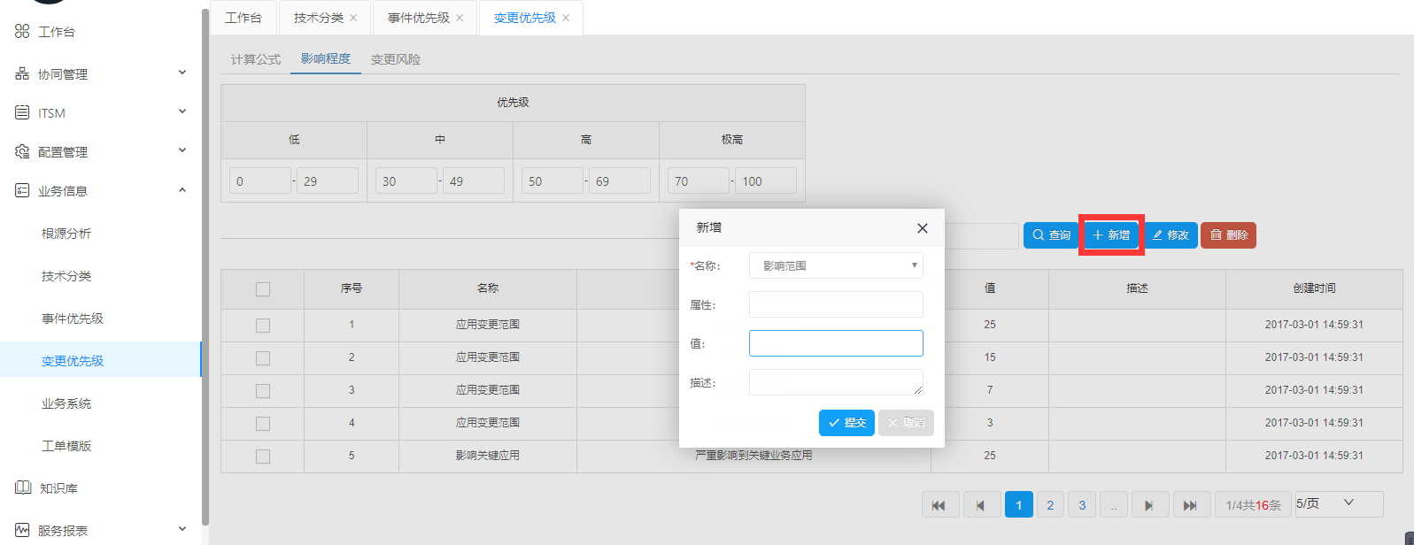 影響程度??蛇x擇查詢、新增、修改、刪除,按要求填寫必填項,根據實際需要填寫。如果確認點擊提交,放棄點擊取消
