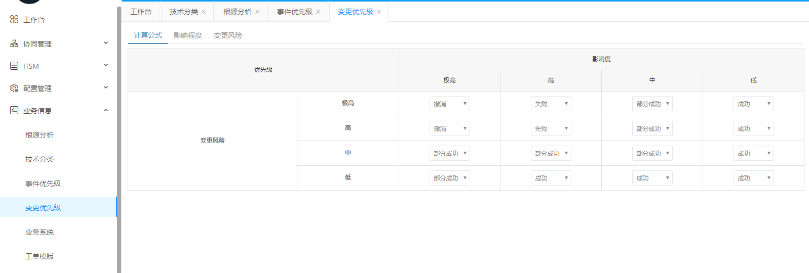 變更優先級,表明了變更的優先程度,包括極高、高、中、低等,并各有相對應的處理完成度。這樣使得變更的安排能夠快速、高效。同時對于變更可能出現的故障也能夠提前預知、預防、預警。并快速定位問題所在,相應處理。
