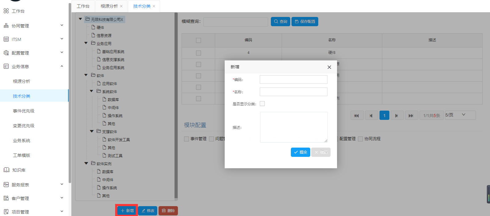 技術分類主要是對于公司所用的軟硬件系統做出分類,便于細化管理。并且包含模塊配置以及模糊查詢??梢钥焖佟⒕珳实牟樵兿鄬哪K。