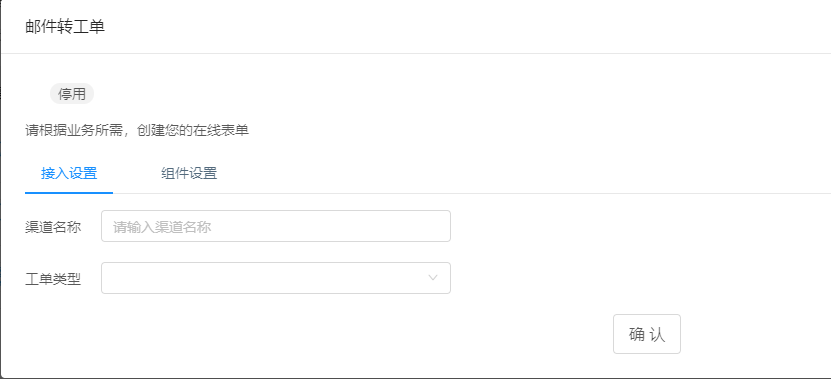 選擇郵件轉工單組件,按需填寫渠道名稱,工單類型等,按確定生成渠道。