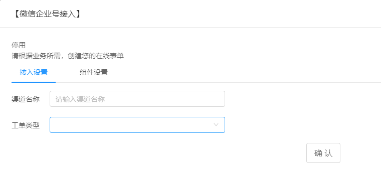 選擇微信企業號接入組件,按需填寫渠道名稱,工單類型等,按確定生成渠道。