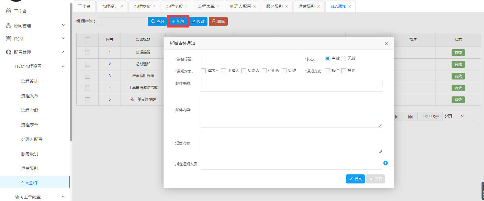 新增SLA通知: 點擊SLA通知-新增,彈出對話框后,填寫標題,選擇通知對象,適當描述一下通知內容。如果確認點擊提交,放棄點擊取消。