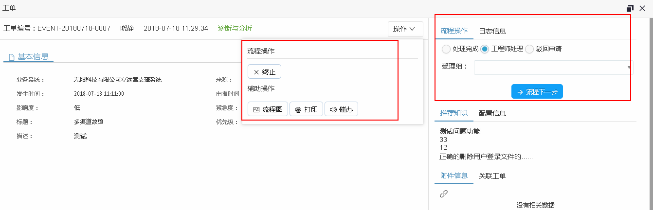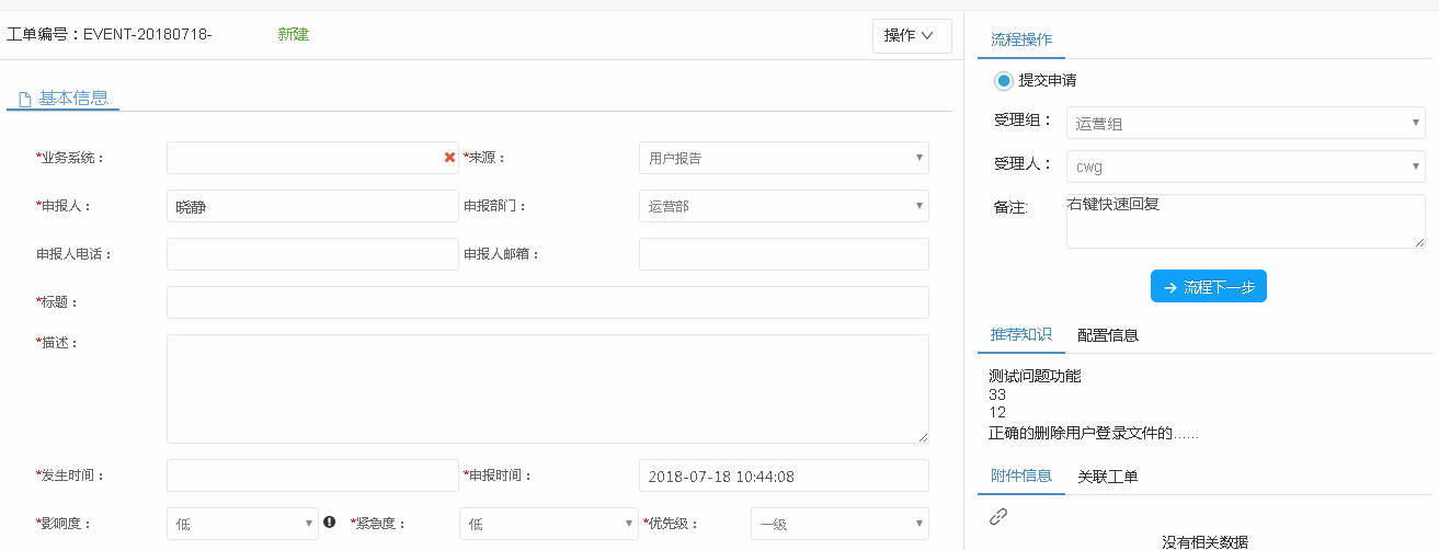 工單受理人點(diǎn)擊需要處理的工單,則可進(jìn)入工單界面。選擇右側(cè)操作流程中要執(zhí)行的節(jié)點(diǎn),填寫左側(cè)表單中的必填項(xiàng)。確認(rèn)界面元素?zé)o誤之后點(diǎn)擊流程下一步