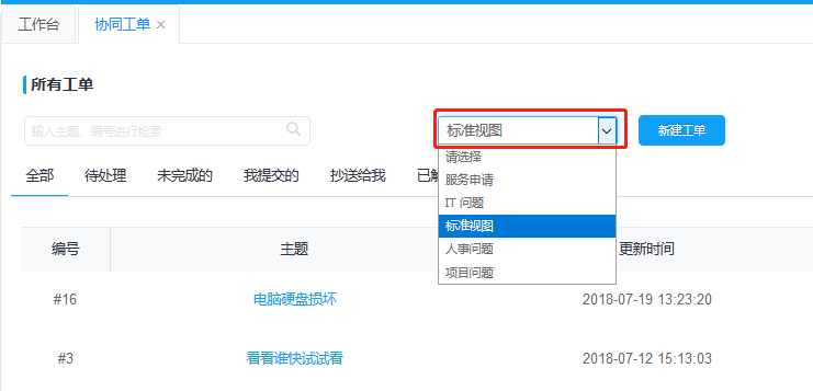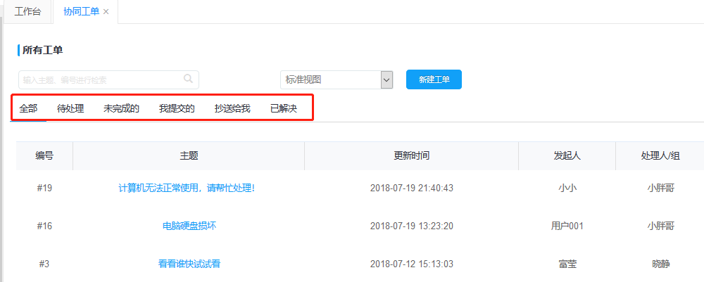 工單隊列分為全部、待處理、未完成、我提交的、抄送給我、已解決,可快速切換標簽查詢到相關的工單,可同時采用檢索功能查詢需要處理的工單。