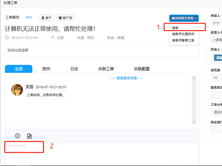 通常情況下,點擊接單后,在消息框內反饋處理進度即可。