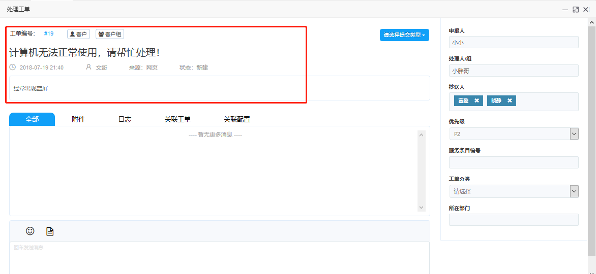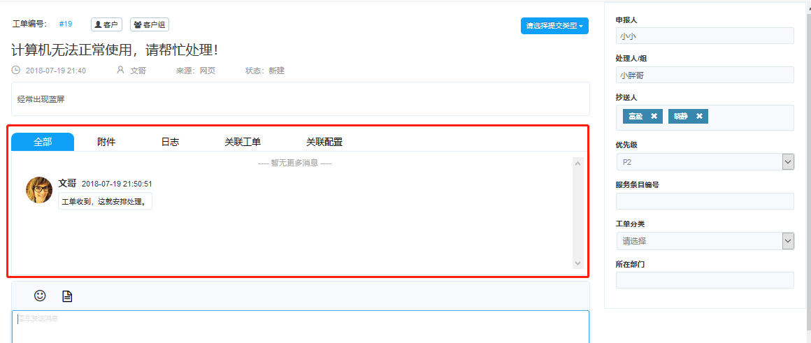 消息區:工單詳情下側為消息區,輸入消息實時溝通。
