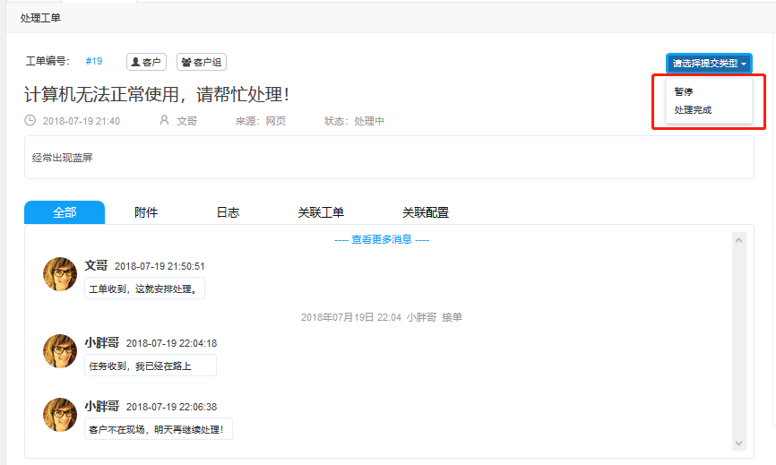 接下來是日志區,包括溝通來往記錄、附件、日志、和關聯工單和配置。