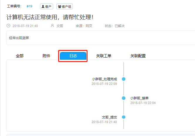 點擊處理完畢,工單被關閉,系統會自動為客戶發送調查問卷。通過日志按鈕,可以直觀的了解工單的處理過程。