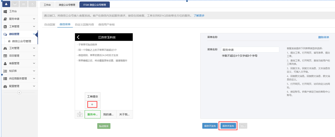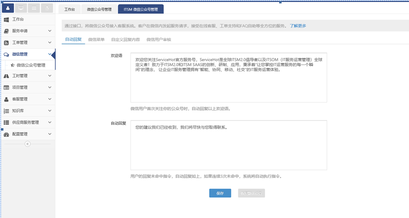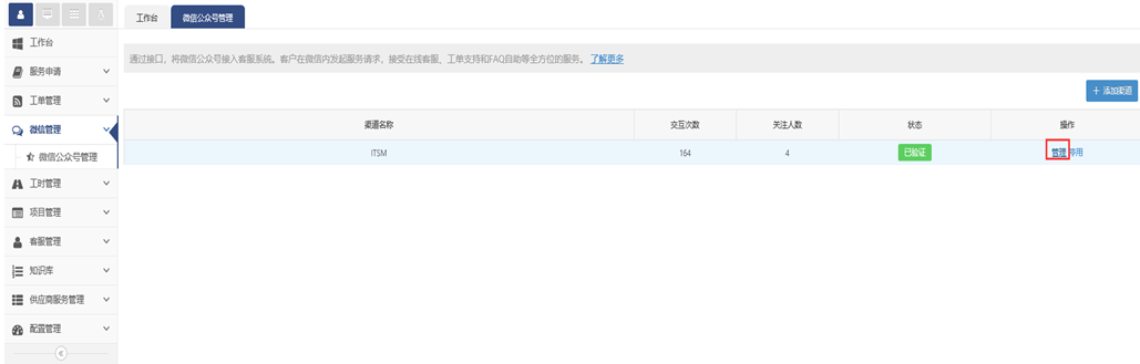 登錄到ServiceHot ITSOM服務管理系統,點擊頁面導航欄中的微信管理—微信公眾號管理,打開微信公眾號管理頁面,如下圖