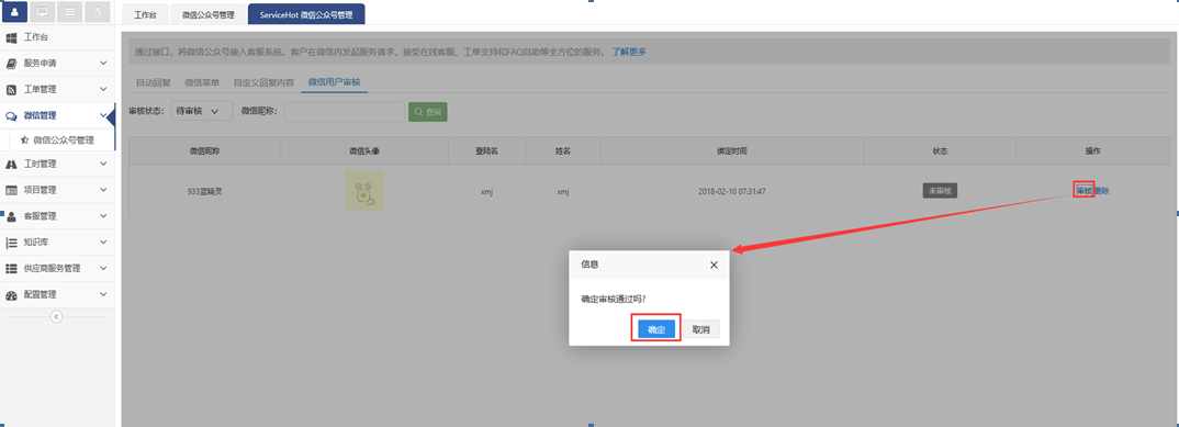 用系統管理員的賬號登錄ServiceHot ITSOM服務管理系統,點擊微信公眾號管理頁面的微信渠道【管理】按鈕,打開ServiceHot微信公眾號管頁面,點擊微信用戶審核這一欄,可以看到待審核的賬戶,點擊操作中的【審核】按鈕,即審核通過,審核通過的用戶可以在微信端執行提交及查詢工單的操作,相關步驟如下圖