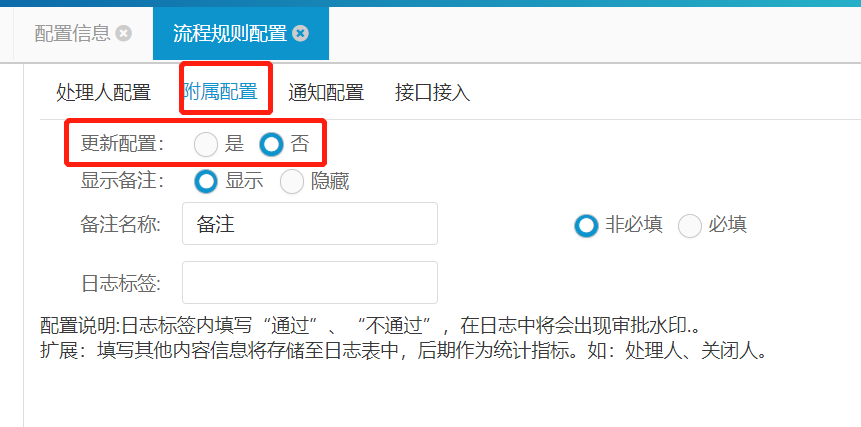 配置路徑:流程規(guī)則配置-附屬配置-是否更新配置。