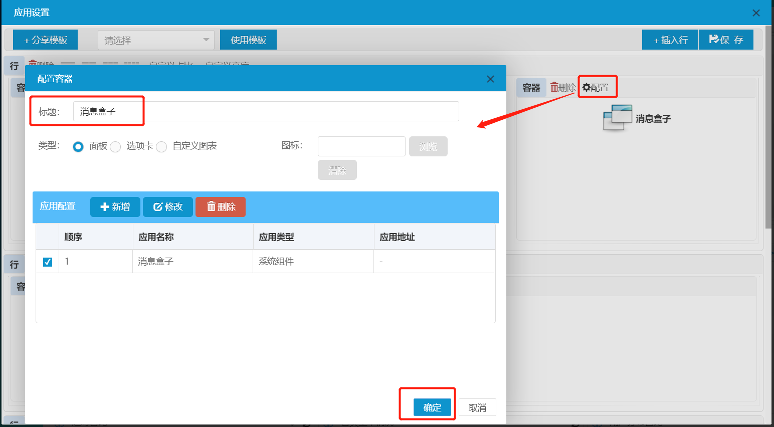 通過管理員【應用管理】,進入應用設置頁面,通過對工作臺顯示內容進行配置,在彈出的窗口字段填入消息盒子即可完成配置