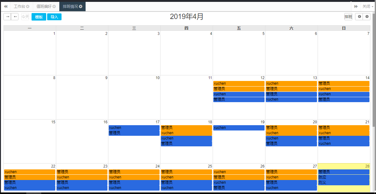值班管理效果圖三:排班日歷