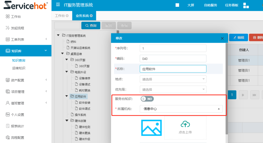 Servicehot ITSM提供復(fù)雜的業(yè)務(wù)分類管理功能,為滿足多組織機構(gòu)和多業(yè)務(wù)系統(tǒng)分類的使用場景,避免每個用戶提報問題時都可以看到全部的業(yè)務(wù)分類,特增加流程與業(yè)務(wù)系統(tǒng)的關(guān)聯(lián)邏輯。比如,分公司一的用戶發(fā)起服務(wù)請求流程,只需要呈現(xiàn)分公司一的業(yè)務(wù)類型。