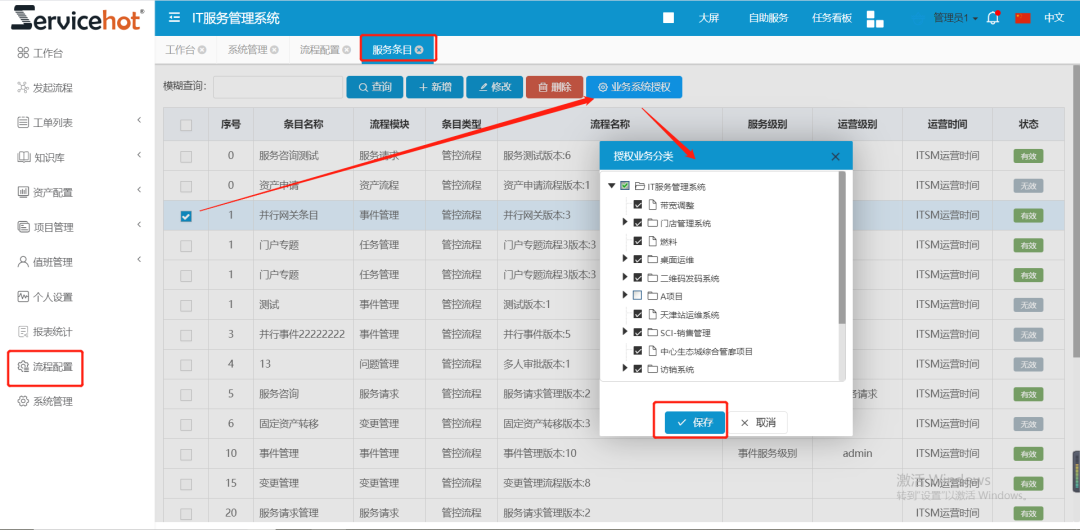 管理員可通過流程配置-服務(wù)條目對不同的業(yè)務(wù)系統(tǒng)進行授權(quán)