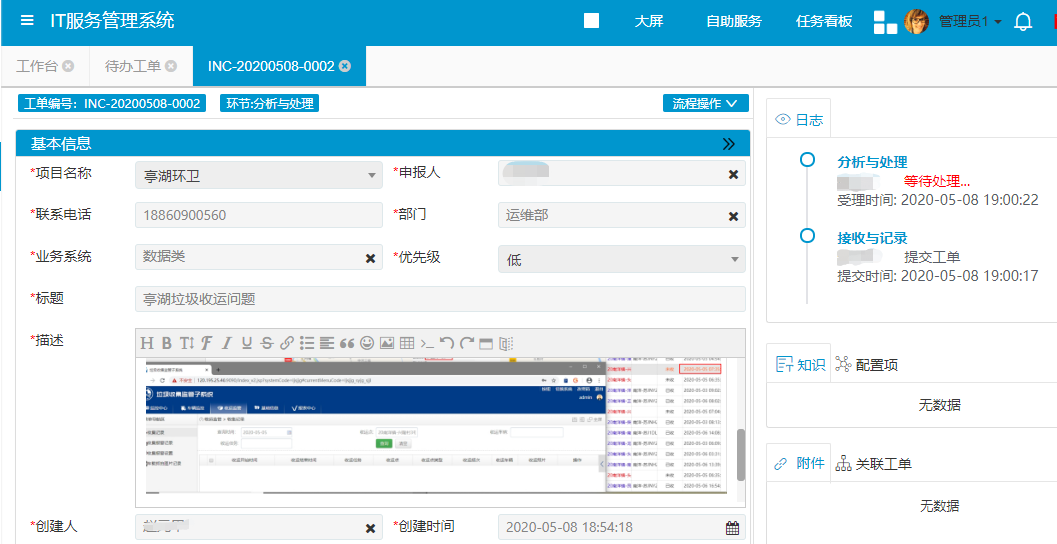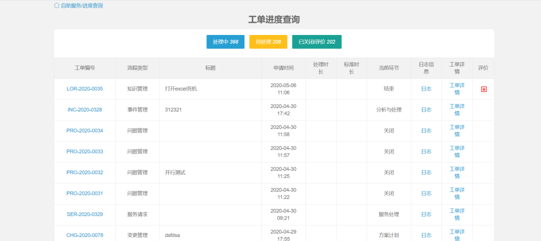 通過統(tǒng)一認證、單點登錄,用戶進入自助門戶后可一鍵查詢工單處理進度,進入工單詳情進行反饋和催辦。