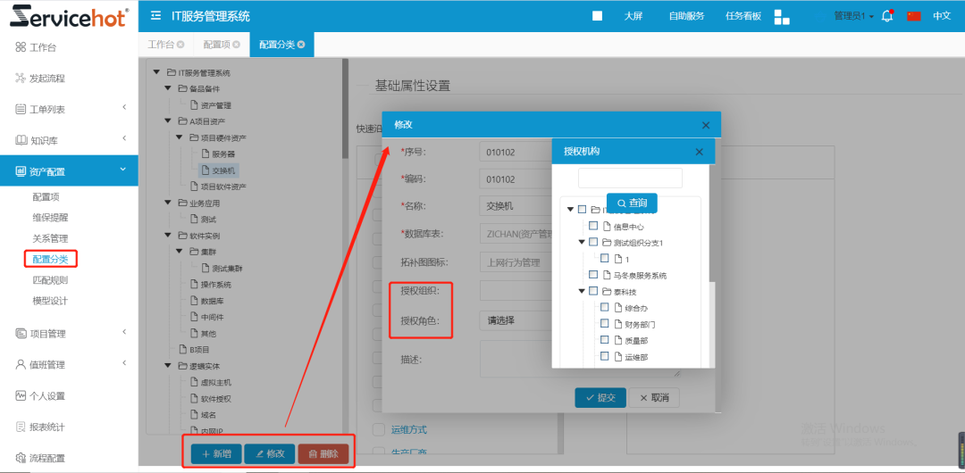 管理員可通過資產(chǎn)配置-配置分類對資產(chǎn)配置相應(yīng)的人員查看權(quán)限,可以選擇組織或角色進行授權(quán)。