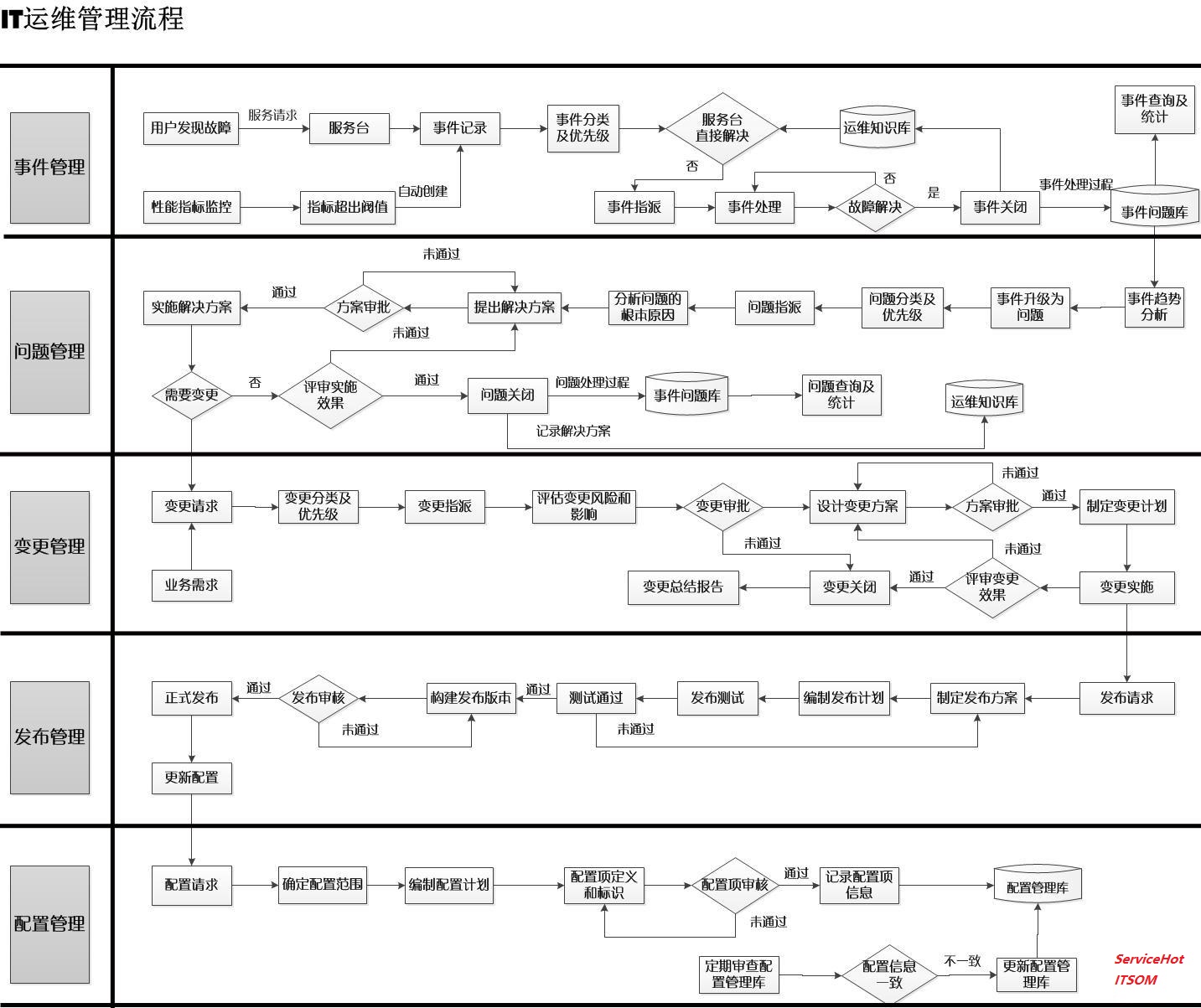 在ITILV3標準劃定的10個核心流程中,與服務支持相關的5個運營級流程與IT系統結合比較緊密,屬IT運維范疇。ServiceHot將IT運維管理核心流程匯總如下: