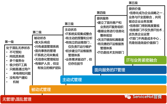 每個企業(yè)的業(yè)務目標、業(yè)務重心、IT目標、IT現(xiàn)狀和IT管理成熟度都是完全不同的,企業(yè)在制定IT服務管理總目標后,需要進一步分析評估組織的現(xiàn)狀,包括組織架構、管理特點、信息化水平、人員素質(zhì)等。