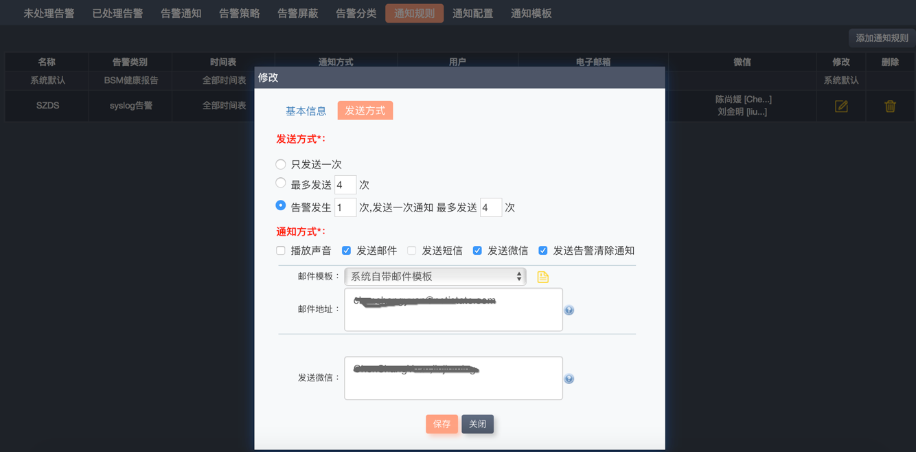 為避免重復信息的干擾,報警發送策略支持靈活配置,進行每次發送、只發送一次、最多發送N次的策略配置。