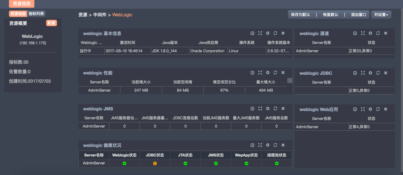 運維監控系統通過儀表盤、曲線圖等可視化的方式展現被監控資源的主要指標狀態,如主機系統、云計算、weblogic中間件、數據庫、服務器硬件等等,如下圖所示。