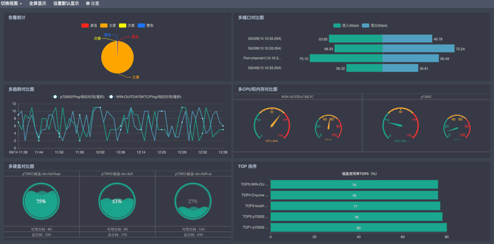 運維監控系統對于不同用戶創建的自定義Portal視圖,可以通過 “走馬燈”的方式進行多Portal視圖的輪詢展現功能。通過對不同的自定義Portal視圖進行間隔的切換展現,能夠使相關的人員能夠知道當前IT網絡環境中所關注資源的整體運行狀態,了解每個部門或者用戶重點關注的資源實時狀態,如下圖: