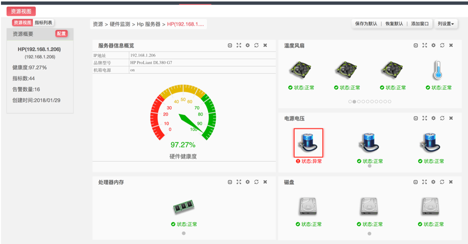 運維監控系統通過帶內、帶外方式兩種方式對PC服務器、小機及刀箱底層硬件狀態進行全面的監控,包括電源、風扇、物理硬盤、Raid卡、插槽等硬件信息,代替管理員的日常機房巡檢工作,使管理員實時了解到服務器底層硬件的運行情況,此種監控方式不通過操作系統,即使系統關機的狀態下仍可監控服務器的基本硬件健康狀況。