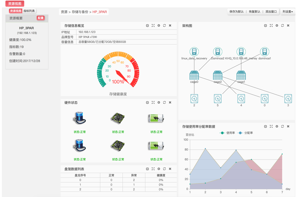 ? 支持存儲性能及磁盤、主機、盤籠之間的架構圖展現,如下圖: