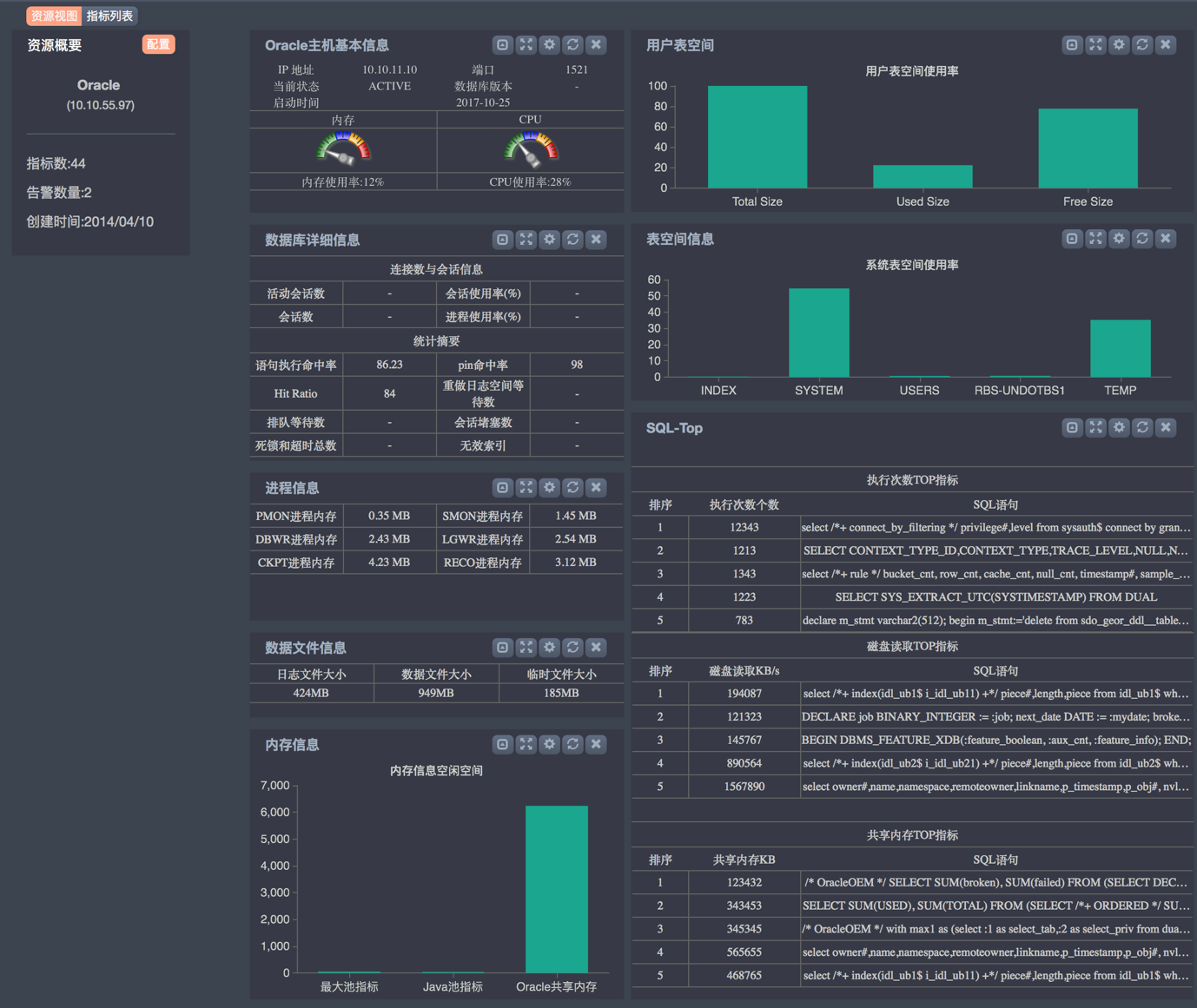 運維監控系統 通過JDBC,對主流數據庫進行監測,包括Oracle、Oracle RAC、DB2、SQL Server、Mysql、達夢數據庫等,能夠監控數據庫關鍵性能指標,如表空間、鎖狀態、會話狀態,并且能夠把占用數據庫資源較多的SQL語句進行排序,方便管理員查找數據庫瓶頸。