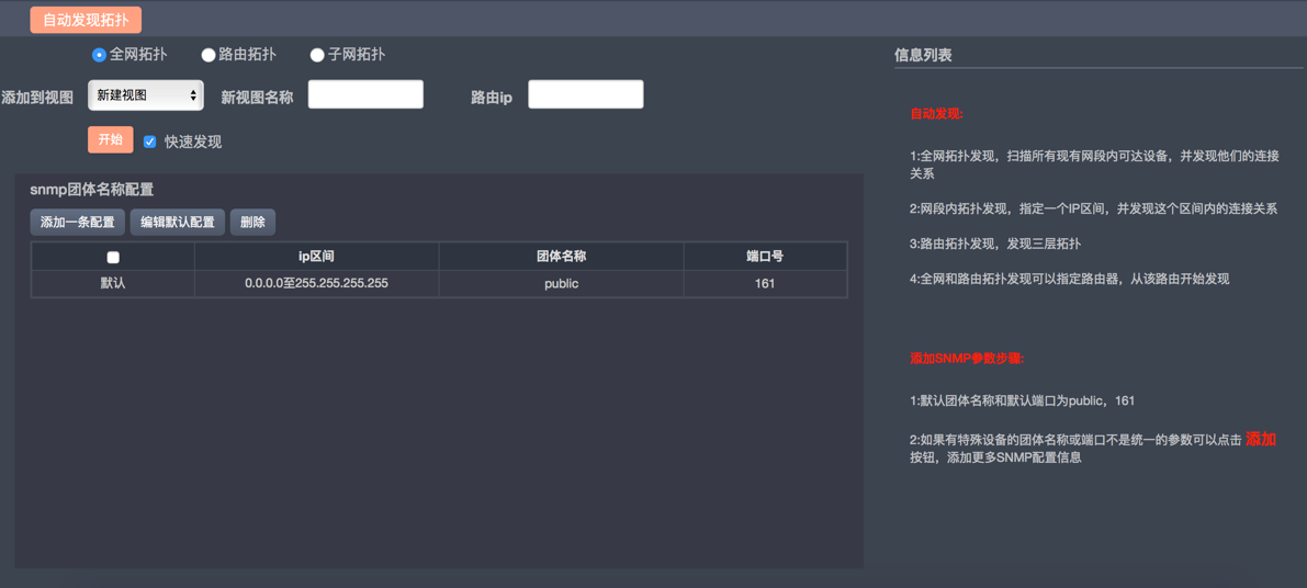運維監控系統提供了自動發現拓撲功能,能夠發現全網拓撲、指定網段拓撲、路由拓撲,能夠自動關聯系統已經監控的設備的狀態在拓撲圖上實時顯示。系統還支持自定義拓撲功能,管理員可以自行增加各種管理視圖,并以可視化圖形的方式展現各種管理視圖。每個管理視圖都將展現不同資源之間的關系、資源的當前狀態和告警報警情況。每個管理視圖也可以設置不同的標題和背景圖。在自定義拓撲頁面能夠顯示拓撲元素的告警信息和資產信息等數據。