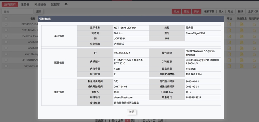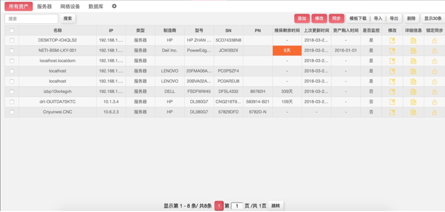 對于服務器硬件,系統可自動發現制造廠商、型號、SN、PN等關鍵信息,并且可以自動同步到相應的資產記錄當中;對于維保時間,可通過手動自定義維保時間,當維保到期,出現高亮或者告警提示,代替資產管理人員維護資產生命周期。