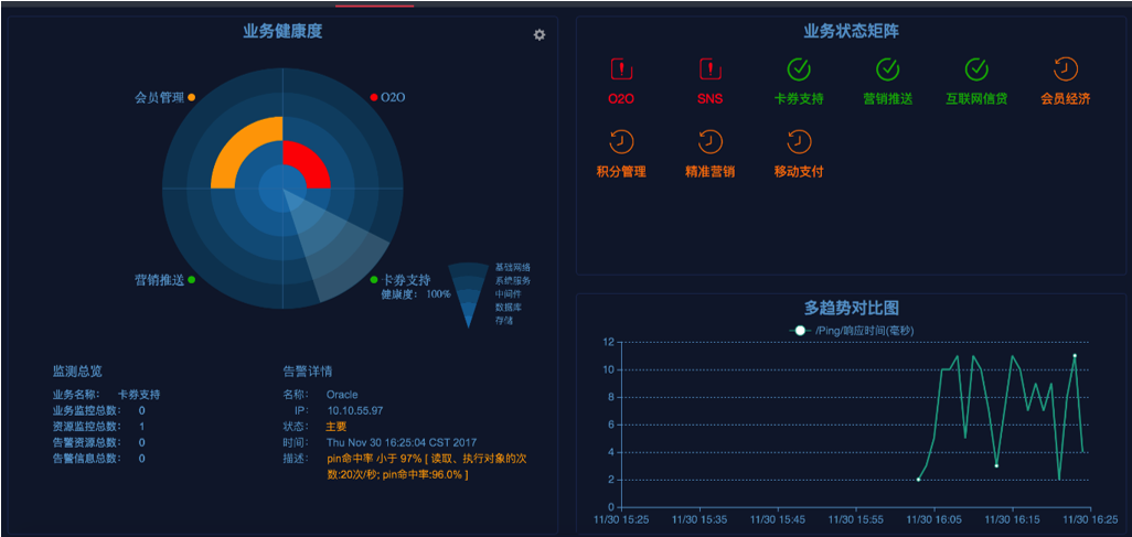 運維監控系統大屏展現視圖以動態模式為管理者提供全局業務狀態一覽。業務健康度視圖以動態掃描的方式清晰的呈現業務的層級結構以及健康度、故障信息,掃描到的業務區域能夠提供健康度信息、業務依賴的資源信息以及告警信息。業務狀態矩陣圖可以批量顯示多個業務的基本狀態信息。趨勢對比圖則很好的展現了核心關注指標的歷史運行信息。從整體到局部,運維監控系統的大屏展現無疑通過管理者的視角為業務進行了一次健康體檢!