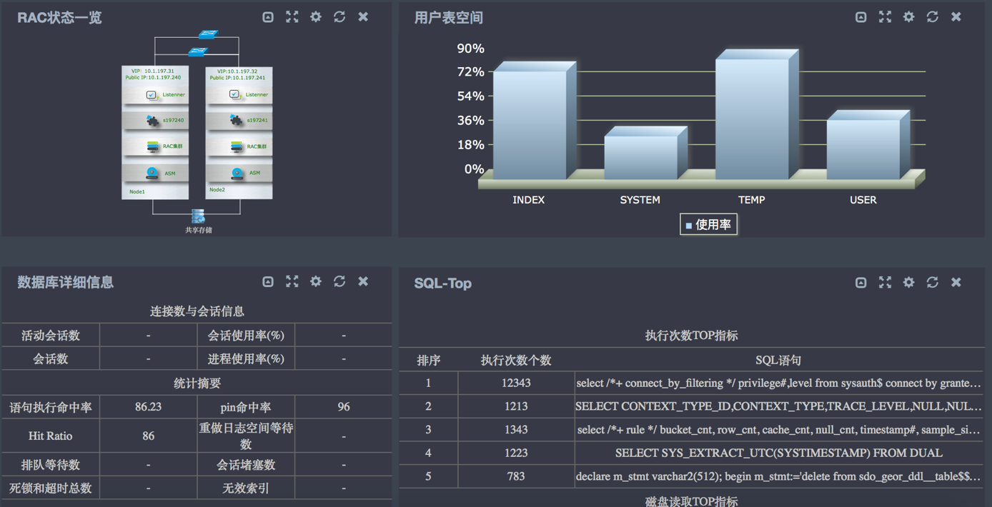 ? 對于Oracle RAC,能夠監測到RAC狀態、集群的狀態、表決磁盤信息、TNS狀態、ASM狀態等,并通過一體化視圖進行全局狀態展現