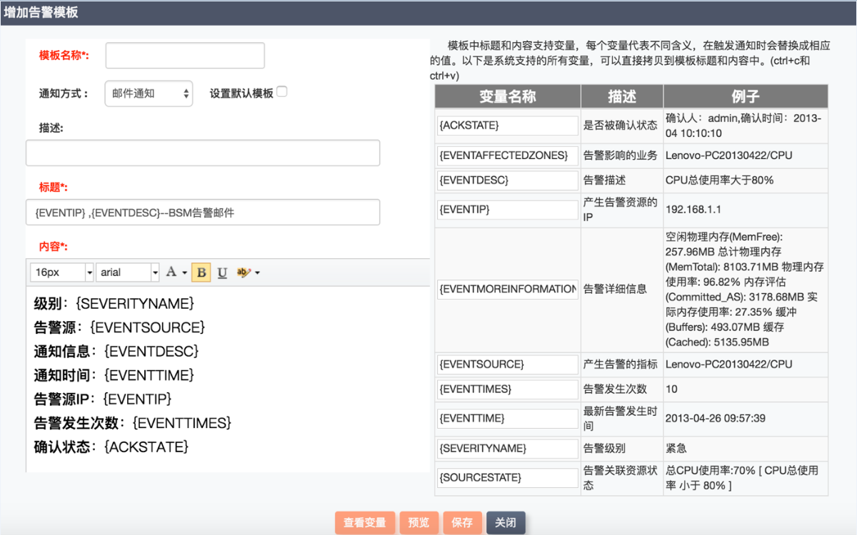 監控系統提供默認的告警通知模板,也可以靈活的手動設置告警通知模板,完全自定義設定通知的具體信息,方便發送郵件或短信,直接選擇填寫的模板就可以。