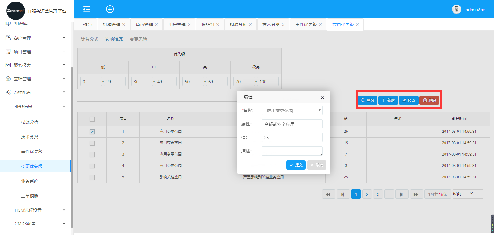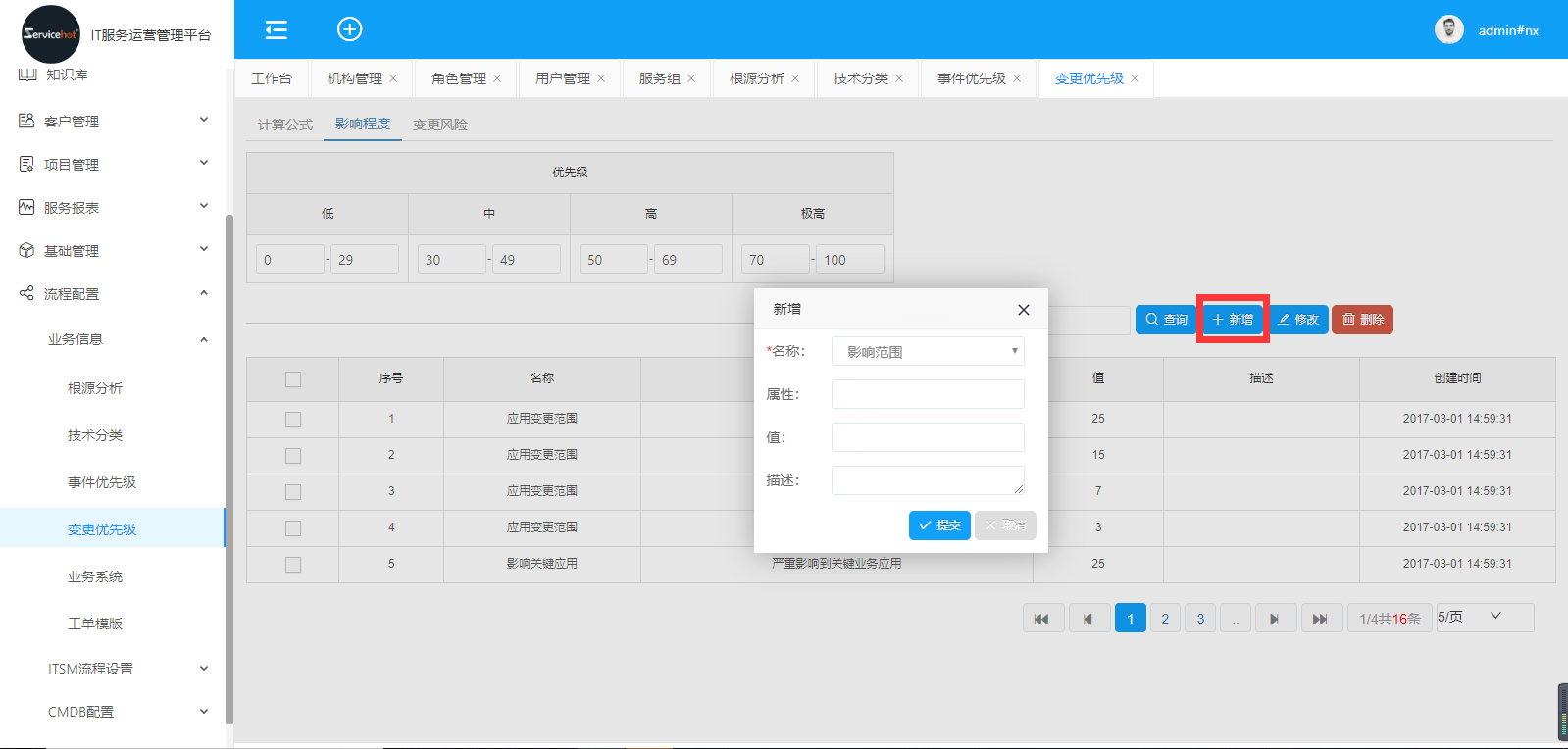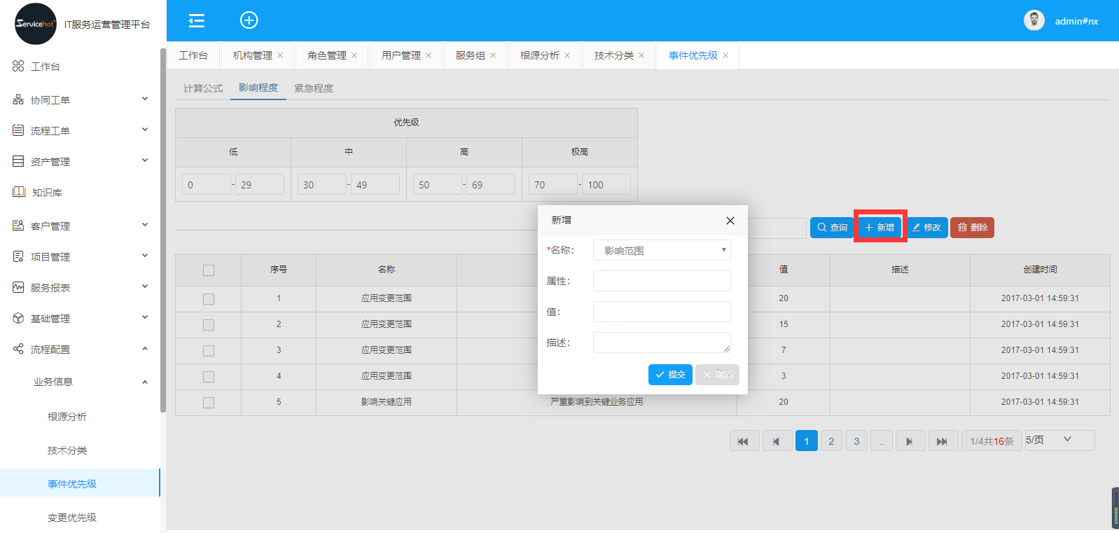 選擇“影響程度”,點(diǎn)擊“新增”按鈕,填寫(xiě)新增的內(nèi)容,點(diǎn)擊提交;
