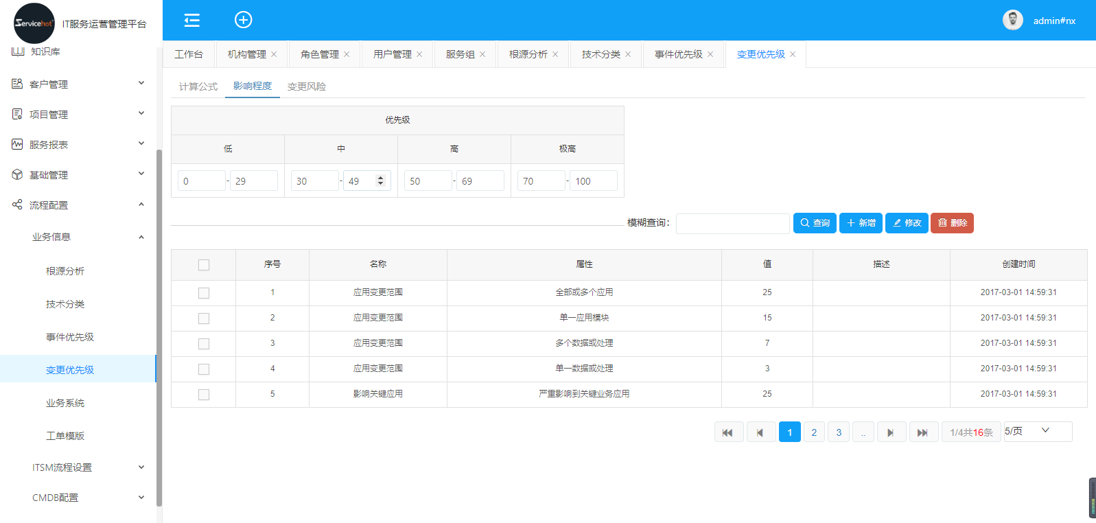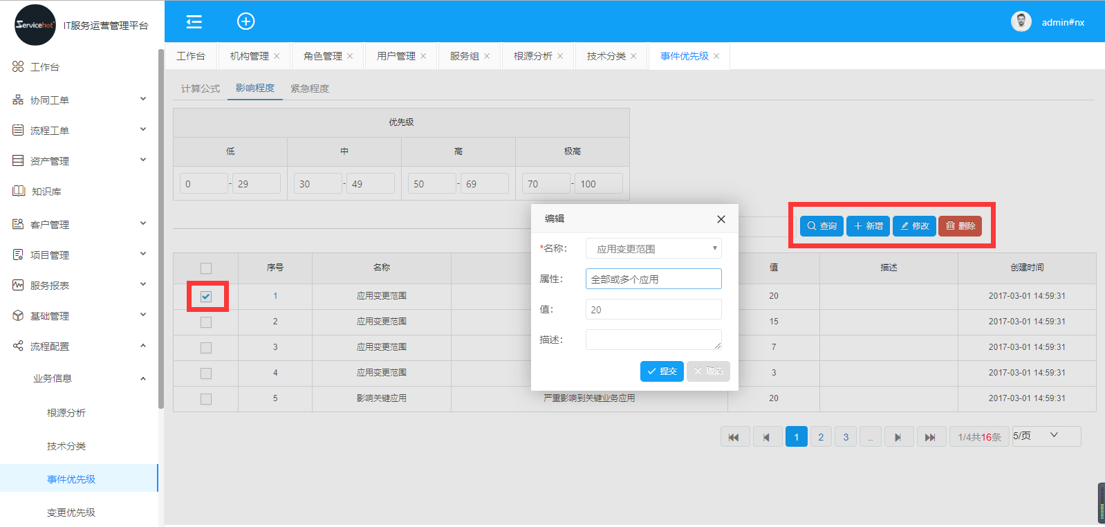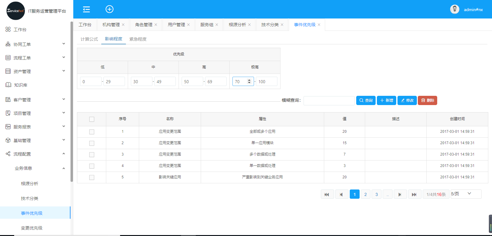 事件優(yōu)先級(jí)通過(guò)影響程度、緊急程度兩個(gè)維度自定義優(yōu)先級(jí)。